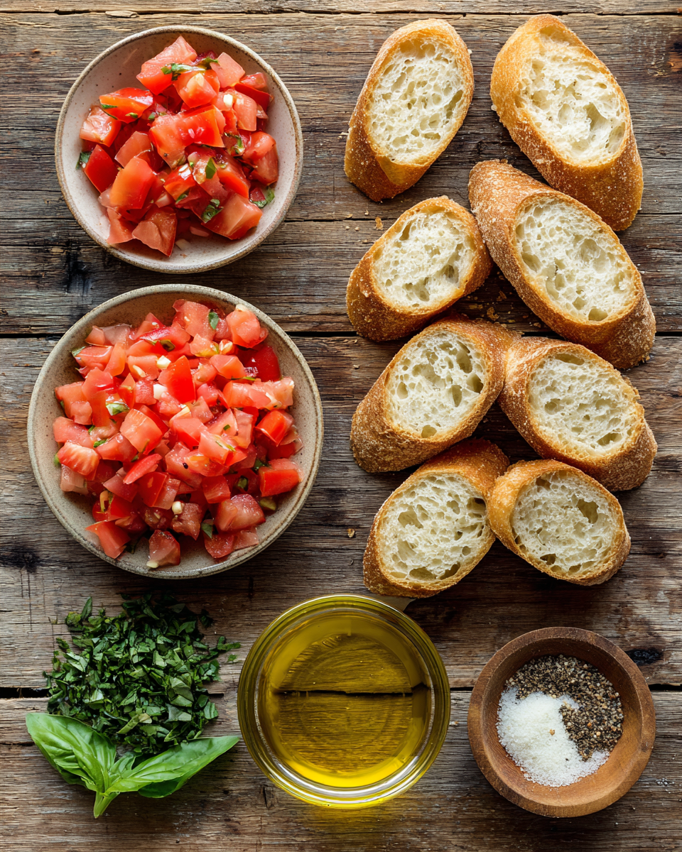 Here’s the beautiful part—you only need a handful of ingredients to make magic happen. But don’t let the short list fool you! Each one plays a starring role in this classic Italian bruschetta. I’m a stickler for quality here—trust me, splurging on good olive oil makes all the difference.