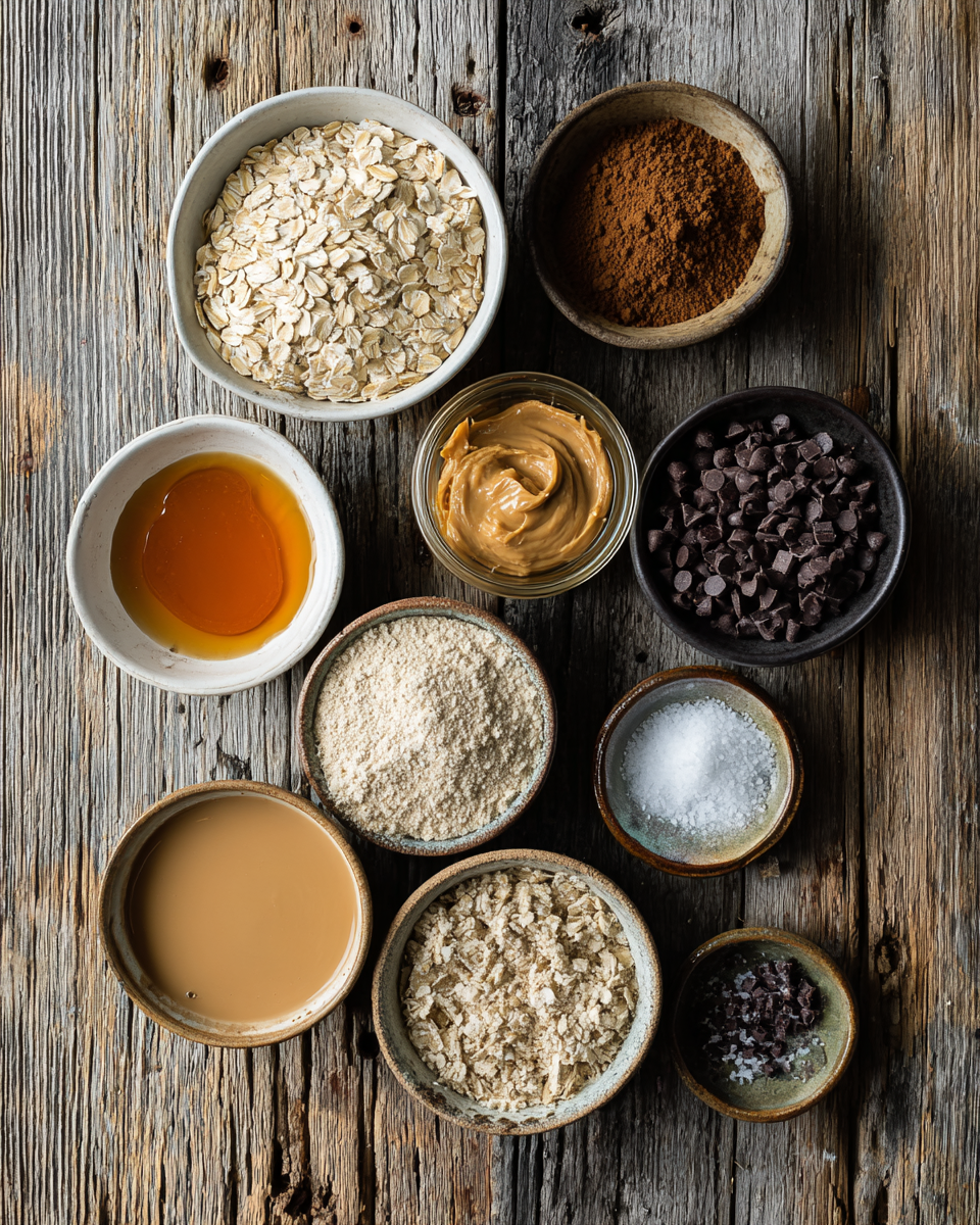 Gather these simple ingredients – chances are, you’ve got most already! Just remember: quality matters here. Cheap peanut butter or stale oats won’t give you those amazing chewy-chocolatey results.
