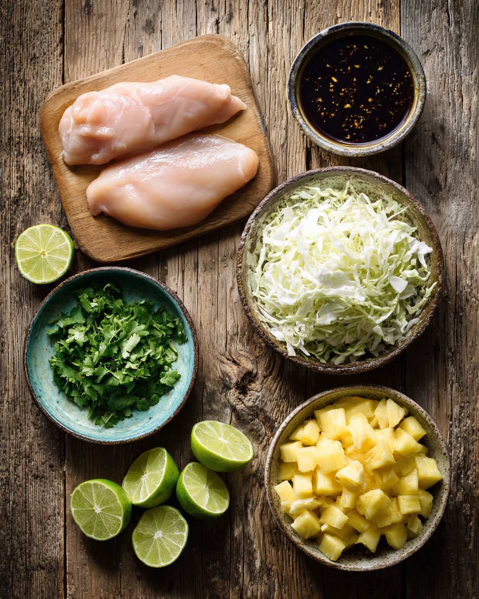 - Fill tortillas with chicken, cabbage, pineapple, and cilantro.