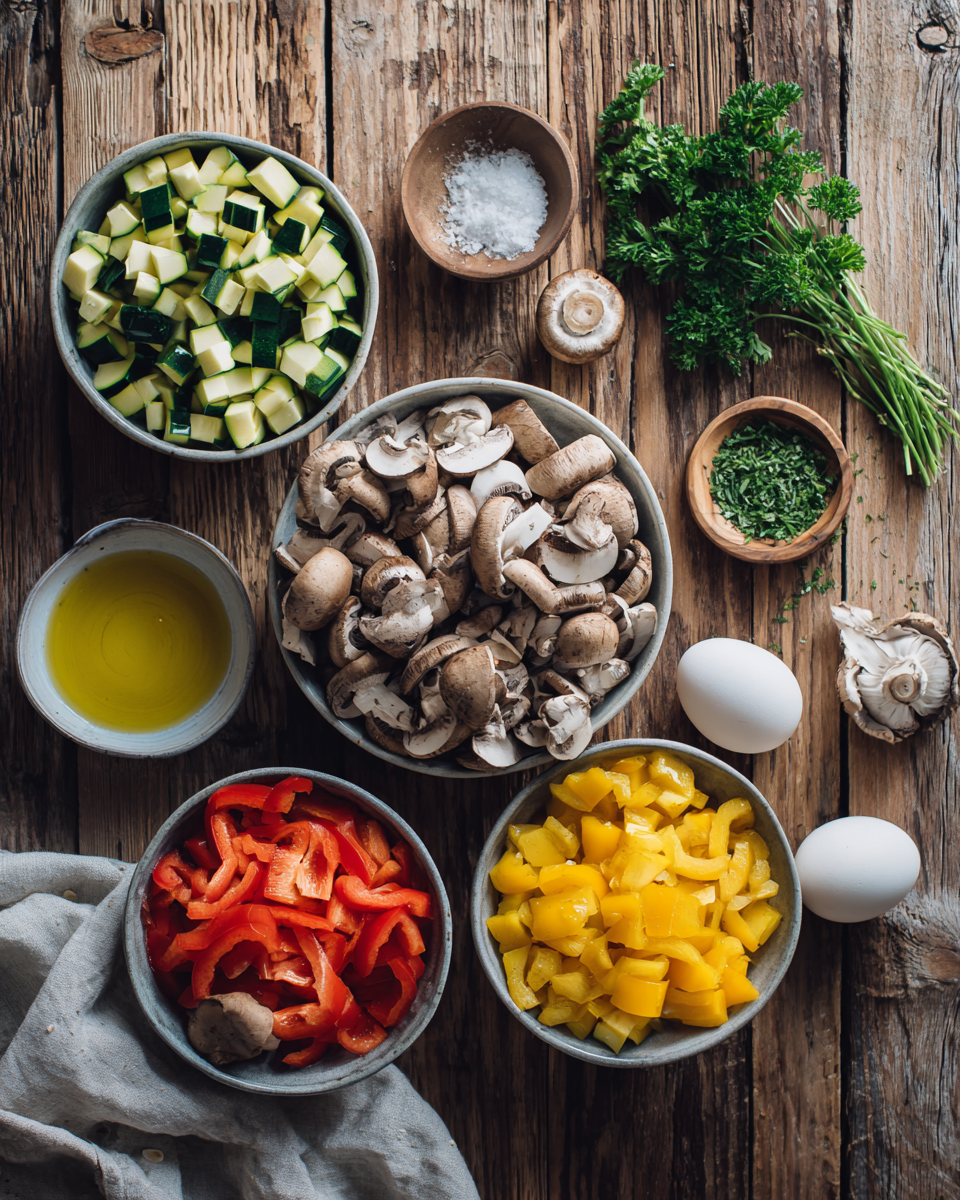 - The veggie crew: 1 medium zucchini (diced), 1 cup mushrooms (sliced), ½ bell pepper (diced), ¼ onion (diced)