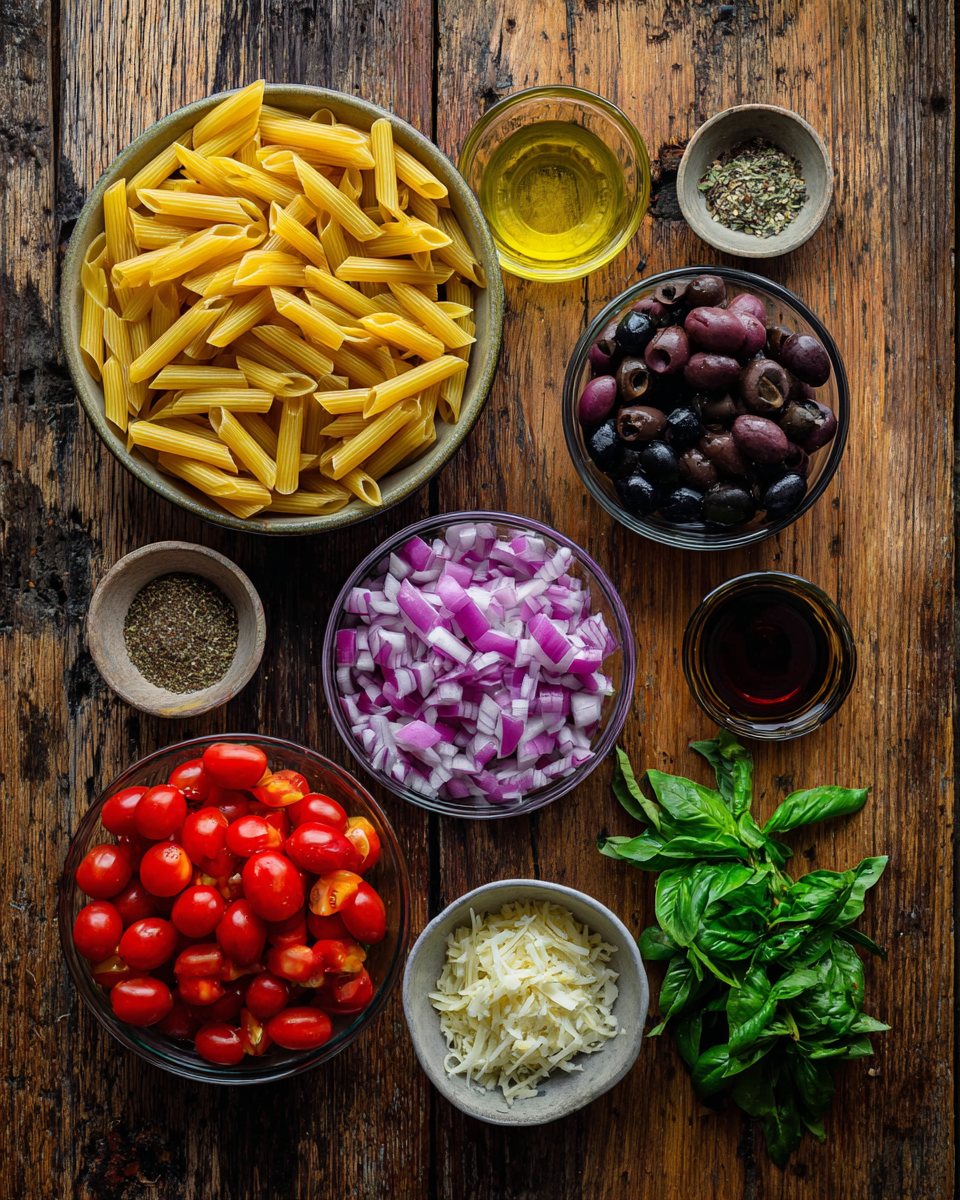 Here’s everything you’ll need to make this bright, flavorful salad – I’ve grouped them so you can prep like a pro. For the dressing: olive oil that fruity good stuff, vinegar for that perfect tang, Dijon mustard (trust me, it makes all the difference), fresh garlic (none of that powdered nonsense), and salt & pepper to taste. Then grab your veggies – sweet cherry tomatoes, briny black olives, punchy red onion, and fresh basil leaves. Oh, and don’t forget the pasta (I’m partial to rotini – those little spirals hold the dressing so well) and that glorious Parmesan for finishing!